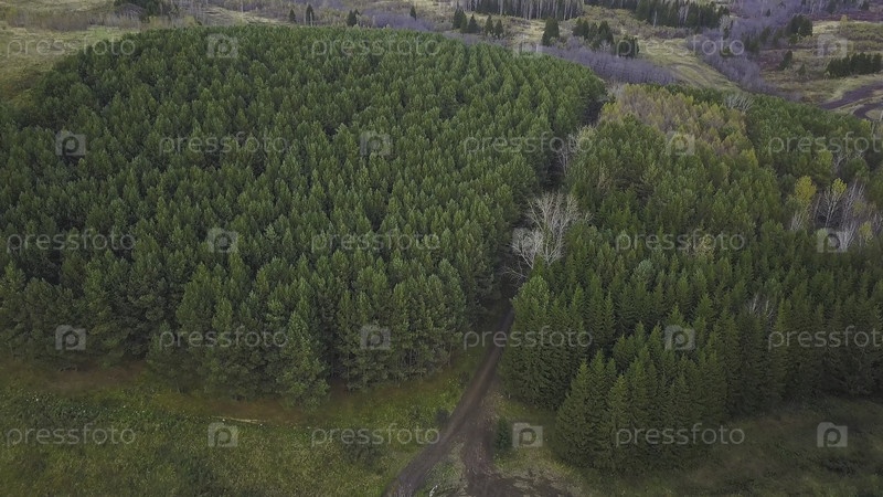 Вид с воздуха, осенний пейзаж дикого леса. Клип. Высокоугольный вид дороги через осенний лес