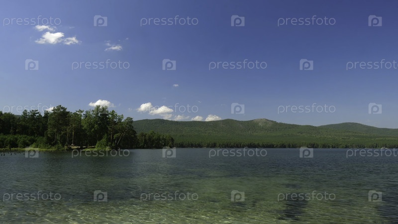 Летний пейзаж с голубым небом, деревьями и озером