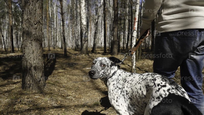 Мужчина гуляет со своей собакой в осеннем парке в солнечный день
