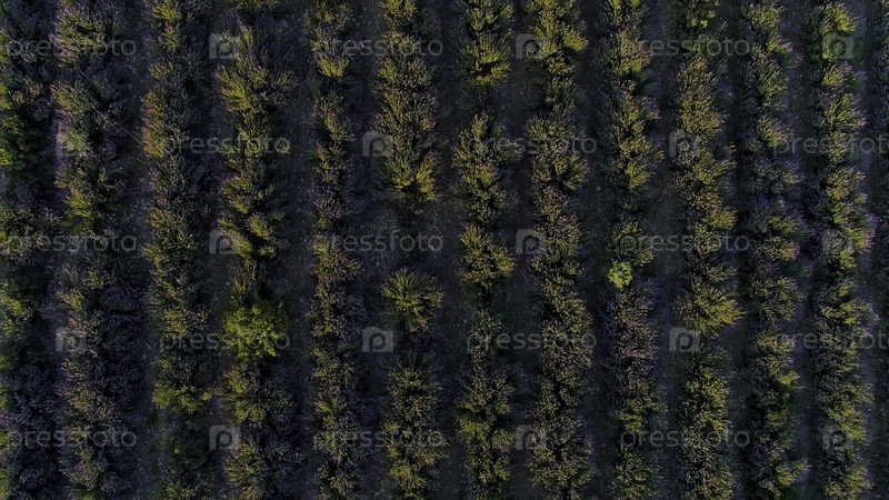 Вид на лаванду при восходе солнца. Стрелять. Вид на красивые ряды цветущих кустарников лаванды, освещенных утренним солнцем. Гладкие ряды фиолетового поля