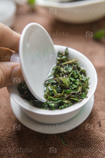 Рука поднимает крышку из миски с свежевыпарившимися листьями зеленого чая, подчеркивая свежести и традиции