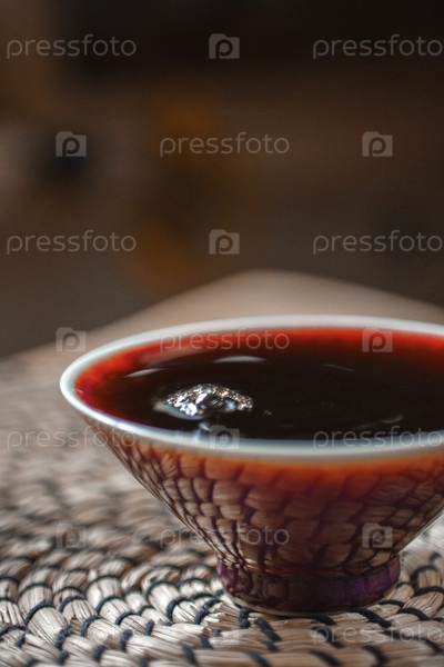 Близкий план обработанной миски, наполненной темным соусом, демонстрирующей сложные конструкции и яркие цвета