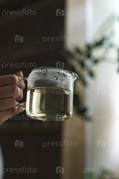 Руки держат потрясающий стеклянный кружок ароматного чая на красивом естественном фоне