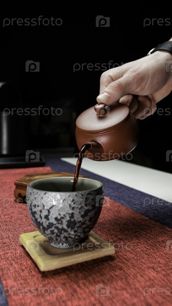 Спокойный и спокойный момент запечатлен, когда чай грациозно наливают из красивого чайника в традиционную чашку