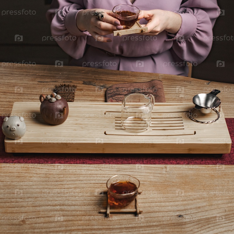 Художественная демонстрация чайной церемонии, которая демонстрирует разнообразие чайников и чашек, изящно расположенных на деревянном столе