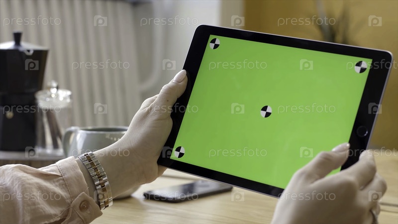 Клубовый снимок красивой молодой женщины, работающей в зеленом экране планшета. резервные кадры. Женские руки держатся и удерживаются на зелёном экране планшета. Я работаю на планшете как фрилансер