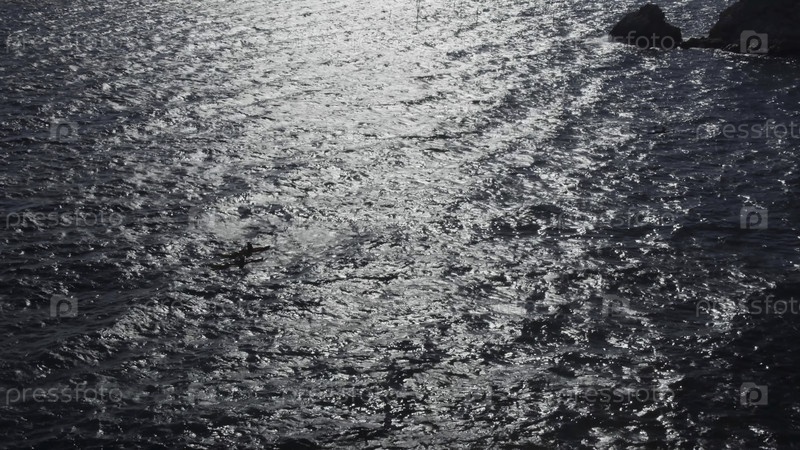 Морские кольца с отраженным солнечным светом и проходящей яхтой. Резервные кадры. Вид на красивые волны моря со парусной яхтой в солнечный день. Медленная съемка проходящей яхты