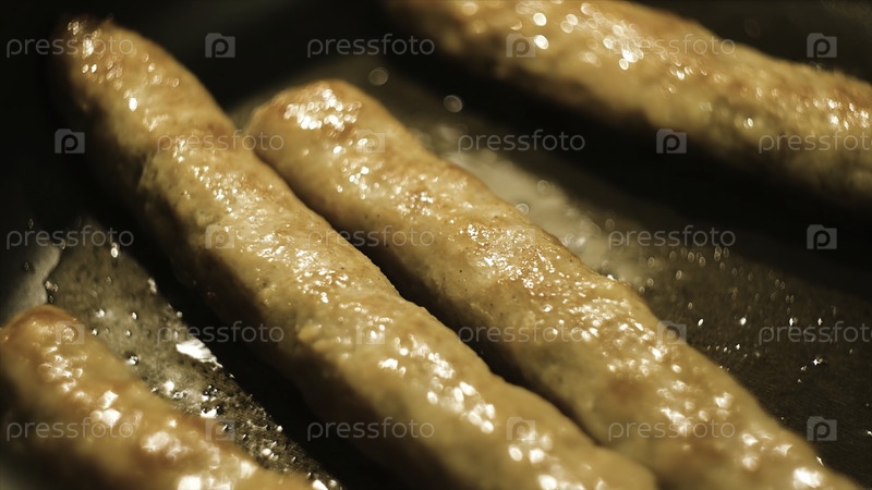 Закрытие мясных колбас, жареных в сковороде.Концепция.Закрыть вид сосисок, жаренных в сковородке.Пан с маслом над газовой плитой