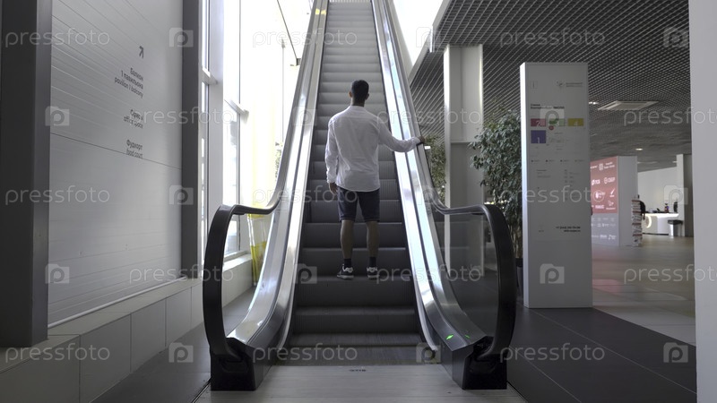 Молодой человек поднимается по эскалаторам в коммерческом здании. HDR. Задний вид мужчины, взбирающегося по эскалаторам. Мужчина поднимается по эскалаторам в ярком здании с большими окнами