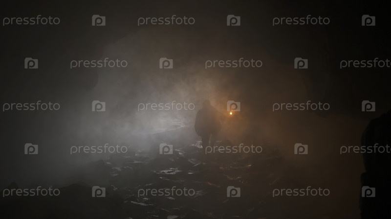 Путешественник с факелом в темной пещере. резервные кадры. Человек с факелем выходит из тёмной туманной пещеры. Силуэт человека со слабым фонарем поднимается по камням в полной темноте пещеры