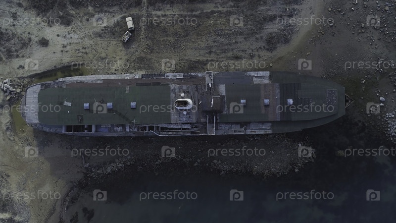 Вид на заброшенное судно.Стреляйте.Таинственный вид старого корабля, смытого на берег.Темная атмосфера старого заброшенного пляжа