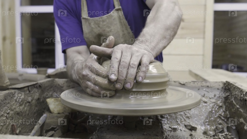 Поттер формирует пластину из глины. Резервные кадры. Руки профессиональных мужчин Поттера образуют контейнер из глины на колесе Поттера. Керамическая мастерская