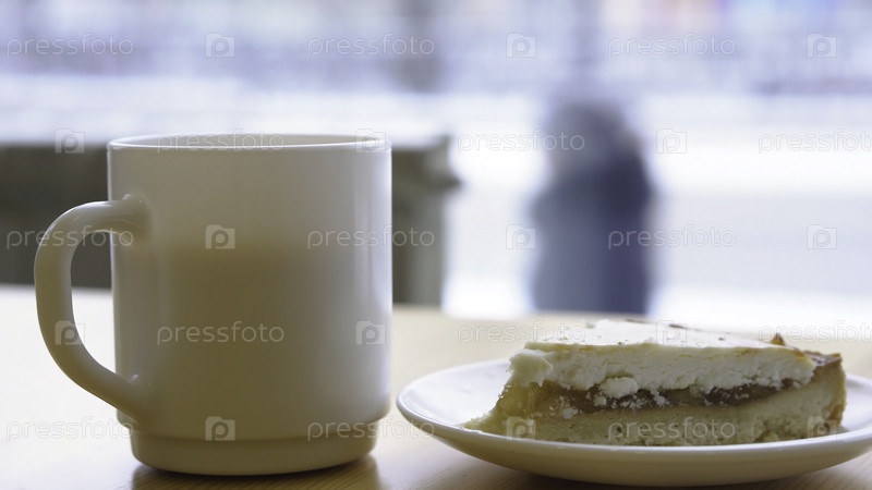 Большая белая кружка и тарелка сырного пирога.Утренний завтрак с кофе и классическим cheesecake на деревянном столе.Сладкий завтрак в кафе на фоне окна с оживленной улицей