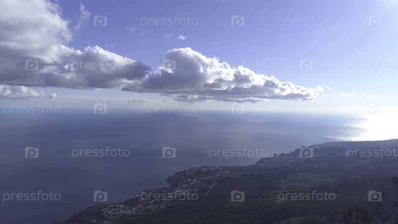 Панорама с вершины горы на город. Снимайте. Вид на прибрежный город от моря. Красивый синий морской пейзаж с голубым небом и облаками на горизонте в солнечный день