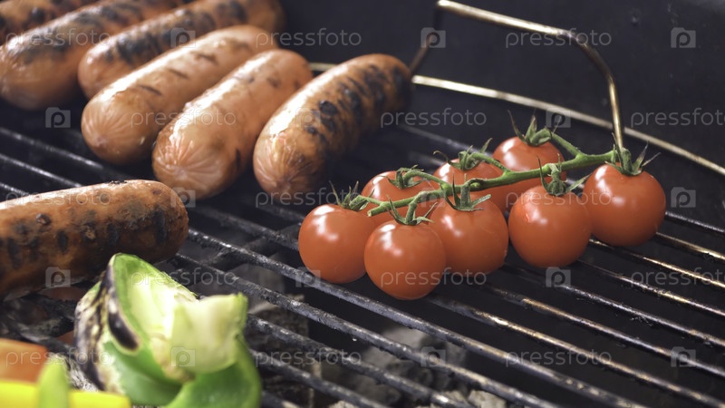 Сочные колбасы и жареные овощи, обед на свежем воздухе, вечеринка в саду