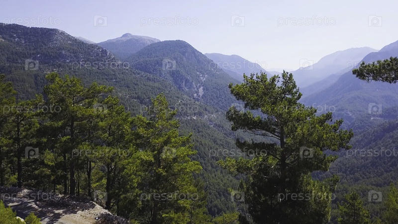 Вид на горную долину, покрытую зеленью. Клип. За сосновыми деревьями есть захватывающий вид на зеленую горную долину в солнечный день. Красивый горный пейзаж покрыт зелёным в ясный летний день