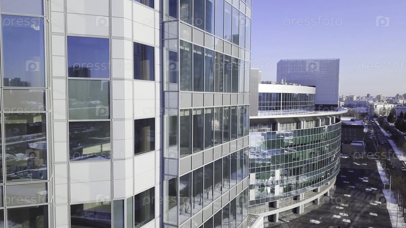 Стекло небоскребов с облаками, Бизнес-концепция архитектуры.Отражение города в окнах башни