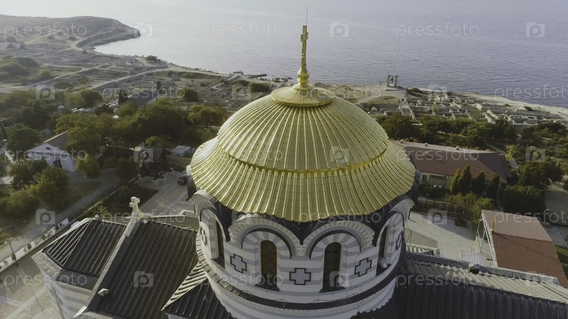 Золотые купола православного Владимирского собора в Херсонесе, на фоне синего моря. Снимок. Самый большой храм на Крымском полуострове. Вид сверху храма Херсонесса