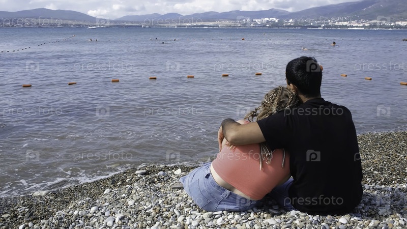 Молодая пара пьет вино на пляже. концепция. задний вид парня с девушкой, отдыхающих у моря. красивая пара сидит на пляже и пьёт вино