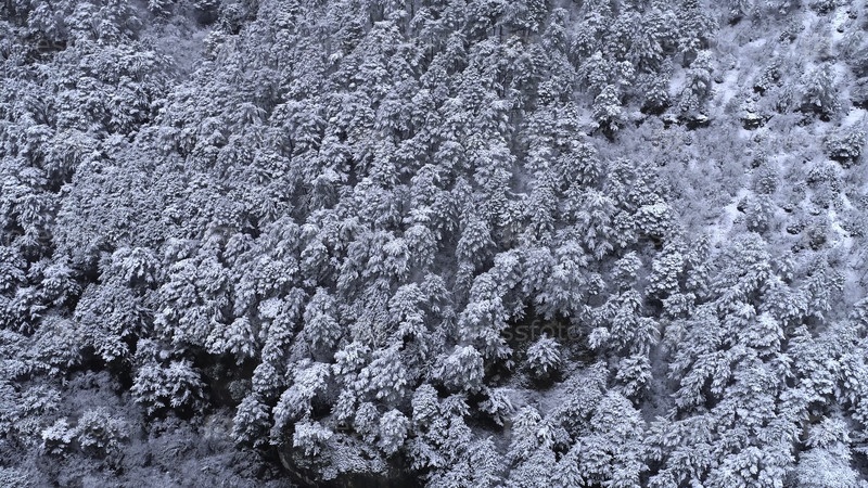 Вид сверху на молодой заснеженный лес хвойных деревьев. Стрелять. На фоне покрытых снегом хвойных деревьев. Зимний вид