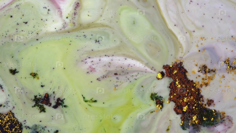 Близкий план цветной порошковой краски на воде. Абстрактный художественный рисунок пятен пылевой краски на белой жидкости. Красивая цветовая настойка цветов на воде