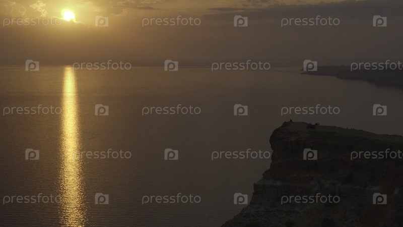 Вид с воздуха высокой скалы и береговой линии недалеко от моря до облачного неба на закате.Снимайте.Удивительный вид на море с отражением заката