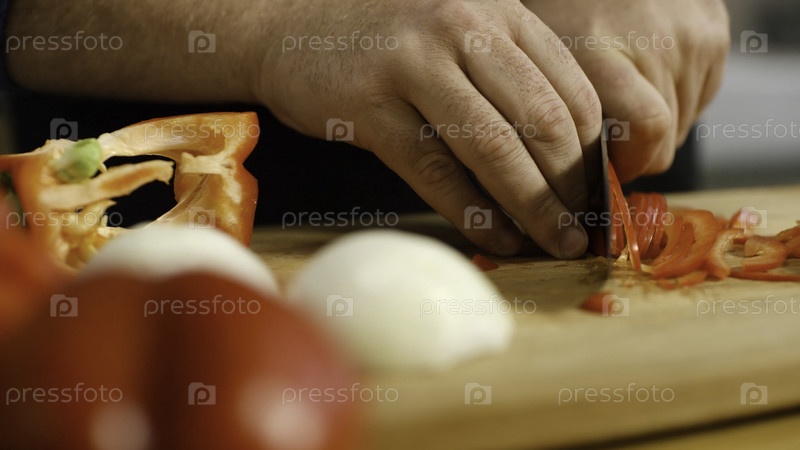 Профессиональный шеф-повар разрезает сладкий перец. Резервные кадры. Ресторанный повар профессионально нарезает красный перец острым ножом