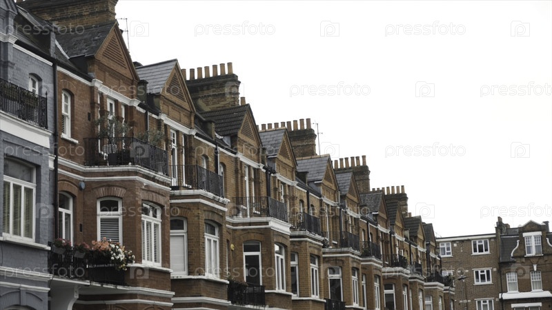 Серия типичных английских многоэтажных кирпичных домов на фоне серого неба осенью.Традиционная английская архитектура