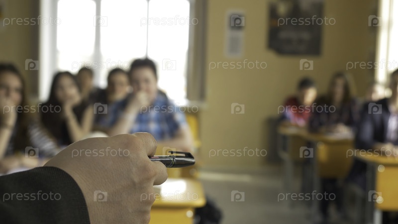 Учитель с группой старшеклассников в классе. вид из рук учителя, объясняющего лекцию