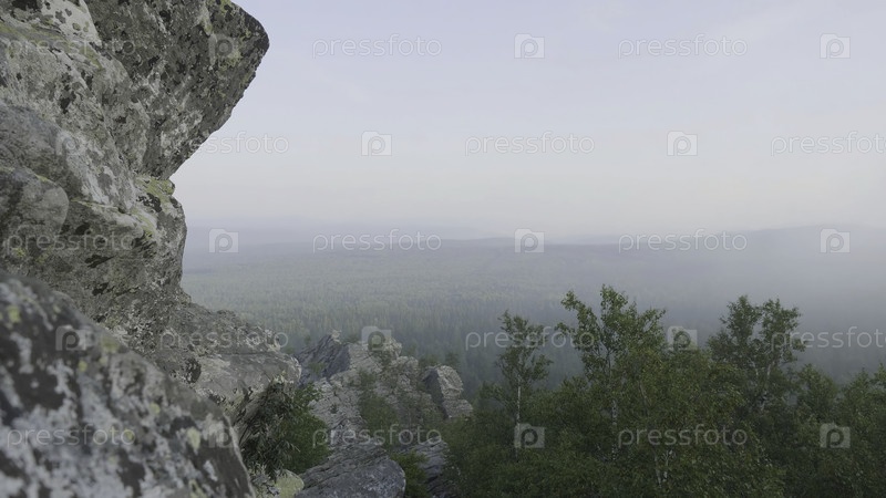 Внешняя перспектива природного ландшафта. Массивные скалы и вид на долину летом. Вид с скал