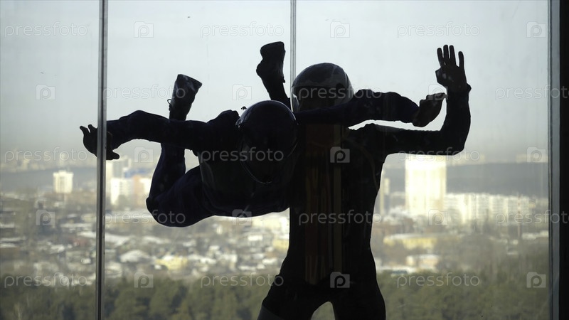 Мужчина-инструктор помогает мужчине летать внутри воздухозабора.Тренировочный полет в трубе с инструктором