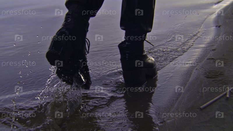 Женщина, которая ходит по воде в ботинках. резервные кадры. женщина в черных стильных кожаных туфлях идет по воде, гуляя на пляже вечером