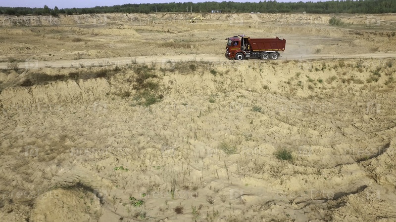 Дампер находится на сельской дороге.Сцена.Вид поездок грузовиков, оставляющих облака пыли на грунтовой дороге в деревне среди карьеры экскаватора