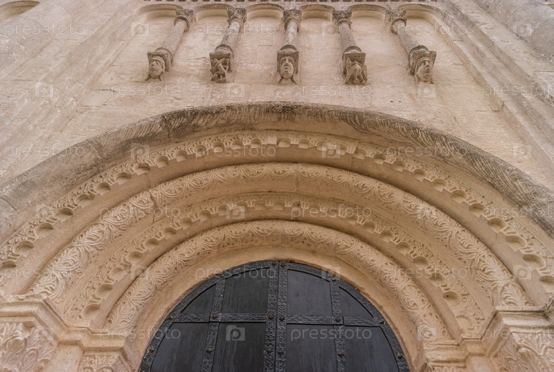 Вид на портал и слепую аркаду на фасаде древней церкви заступничества из белого камня на храме Нерль в Владимирской области России, построенной в 12 веке