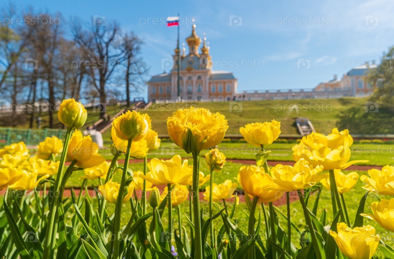 Вид на желтые тюльпаны с восточной часовней и флагом на заднем плане Парк Петергофа весной Санкт-Петербург, Россия