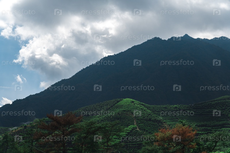 Потрясающий живописный вид демонстрирует яркие зеленые горы, изящно расположенные под драматическим облачным небом