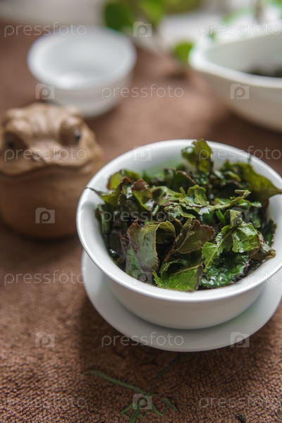 Красивая миска, наполненная свежими листьями зеленого чая, элегантно окружена традиционными чайными изделиями и аксессуарами