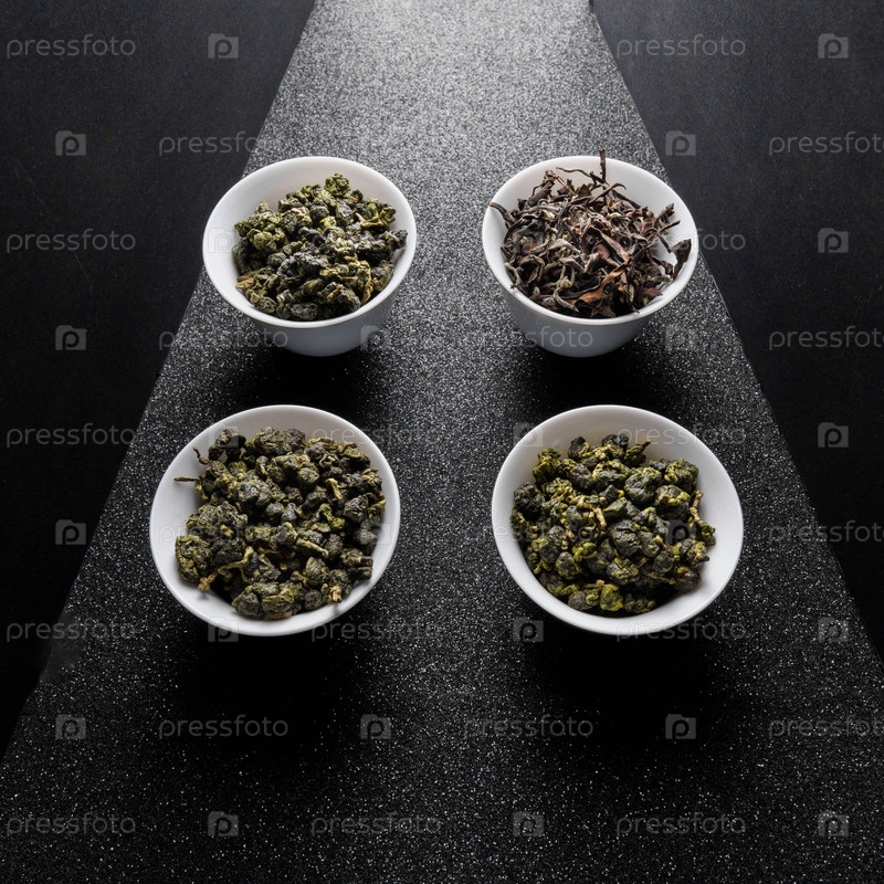 Потрясающее и красивое расположение различных свободных чаев элегантно отображается в мисках на текстурированной темной поверхности