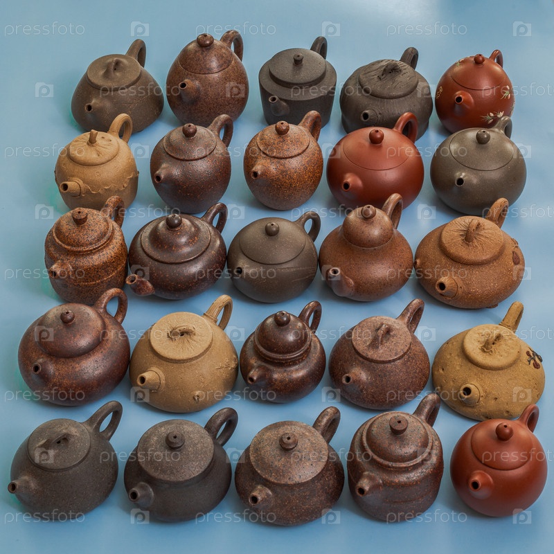 Обширная и художественная компоновка чайников, показывающих разные формы, цвета и различные отделки