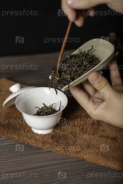 Мягко умелая рука наливает свободные ароматные чайные листья в изысканный керамический сосуд для процесса приготовления пива