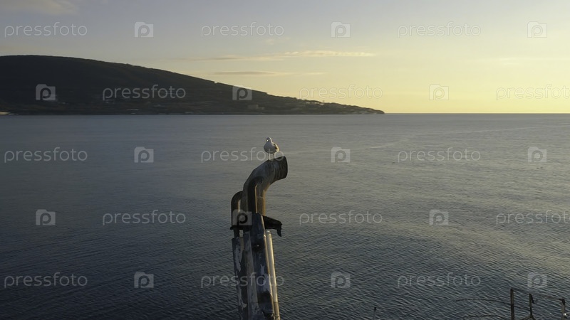 Идея старой и разрушенной бочки корабля и чайки, сидящей на ржавой трубе на закате солнца