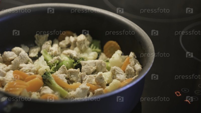Курица и овощи тушены в кастрюле. Концепция. Внимательно приготовьте сытный и здоровый обед из свежих ингредиентов. кусочки курицы и свежих овощей вкусно жарены на сковородке
