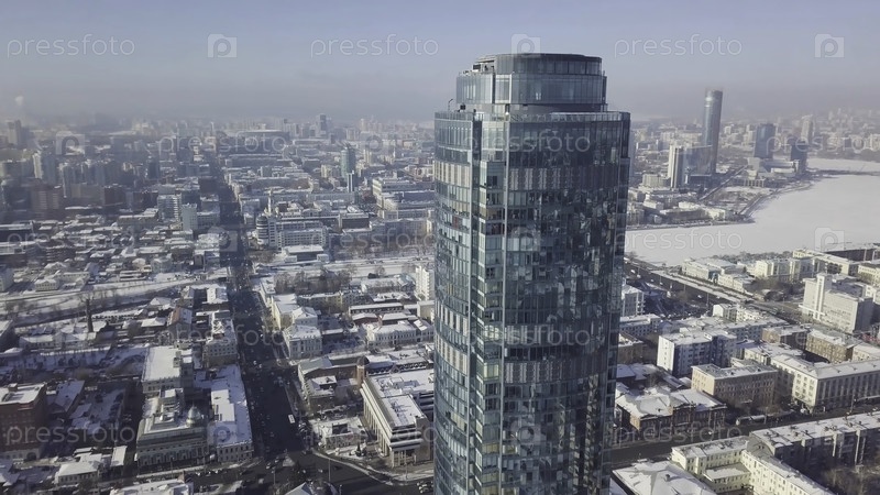 Вид на небоскреб и современный город зимой. Великолепный небоскреб под солнцем