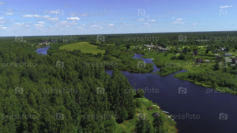 Природный пейзаж с зелеными деревьями, широкой рекой и зелёным полем.Снимать.Авиационный вид летнего ландшафта с лесом, зелеными лугами и рекой в сельской местности, воздушное приключение летом