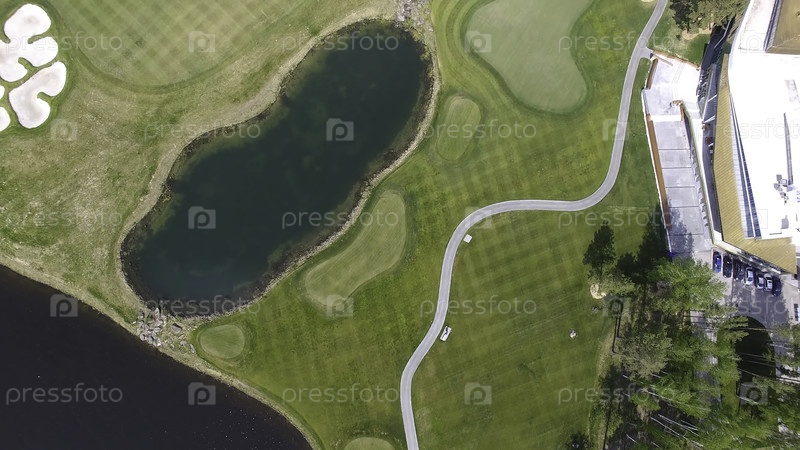 Поле для гольфа в солнечный день, отличный голф-клуб с прудами и зеленой травой, вид на небо