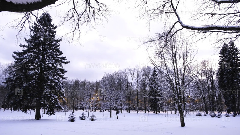 Вид на снежный зимний парк с фонарями.Концепция.Прекрасные сосны и фонари в парке зимой