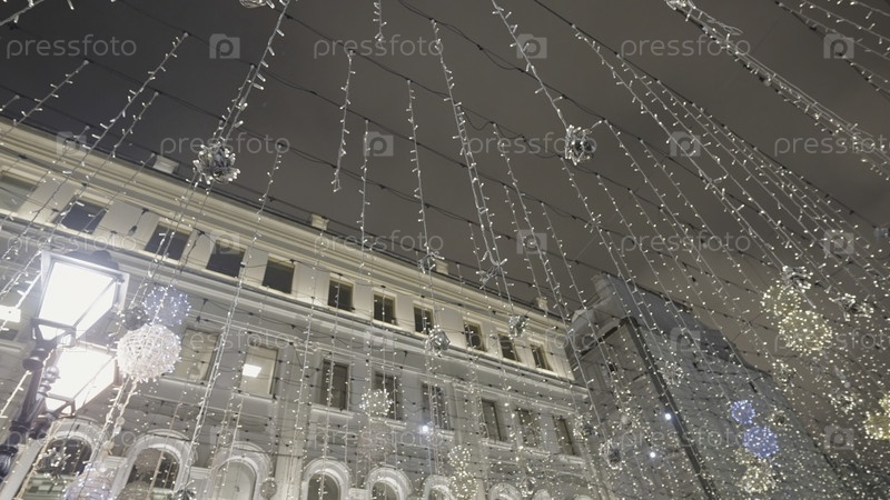 Красивые висящие гирлянды на городской улице. идите вперед. снизу вид сверкающих гирлянд, которые украшают улицу. праздничные декорации улиц и домов города ярко сияют вечером
