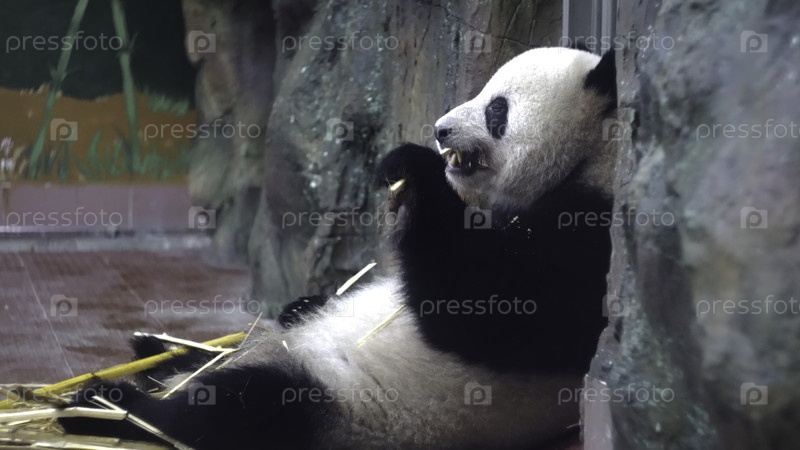 Панда ест бамбуковые стебли в зоопарке. СМИ. Чубби-панда сидит лениво и любит есть бамбук - крепкие зубы в зоопарке. Растительная пища из бамбуковых стеблей панды