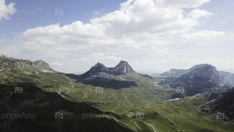 Вид сверху на горную панораму. Сток. Солнечный день с облаками в горах. Впечатляющий пейзаж гор и скал. Горная долина со скалистыми скалами
