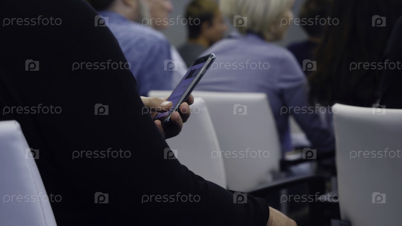 Бизнесмен использует свой смартфон в офисе.Молодой бизнесмен печатает текст в телефонной мастерской